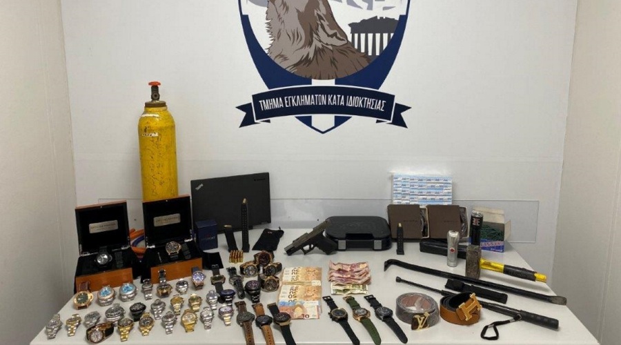 Στην κατοχή τους, καθώς και από τις έρευνες σε οικίες και χώρους, βρέθηκαν και κατασχέθηκαν φιάλη υγραερίου, ηλεκτρικά καλώδια, φυτίλια, πιστόλι, φυσίγγια, λοστοί, βαριοπούλα, μικροποσότητα κάνναβης, πλήθος ρολογιών, κινητά τηλέφωνα και κάρτες SIM.