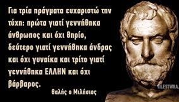 Ο Θαλής ο Μιλήσιος. Ο εκ της Μιλητου. Φιλόσοφος. Ο πρώτος Έλληνας φιλόσοφος. Απ' αυτόν ξεκίνησε η φιλοσοφία της Δυτικής Ευρώπης. Μαθηματικός, φυσικός, αστρονόμος. Τεράστιο μυαλό. Προσφορά του στο γένος των ανθρώπων ότι χάρη της επιστημονικής του σκέψης άρχισαν να απορρίπτονται οι μύθοι, θρησκευτικοί κι όχι, που τους είχε γεννήσει η λεγόμενη λαϊκή σοφία προκειμένου να ερμηνεύσει ανεξήγητα γεγονότα ή να τα... εξηγήσει.